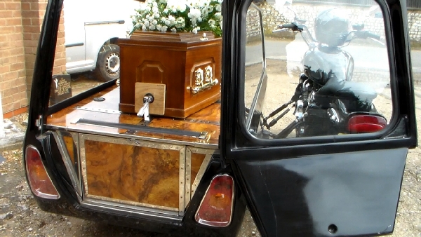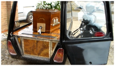 We are more than happy to discuss and quote for any special requirements. Below are some photgraphs of both a traditional but older style Horsedrawn Hearse and two of our more unusual ones: A motorbike and sidecar specially built hearse and a Flatbed Lorry originally owned and operated by the deceased.